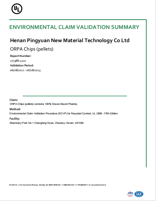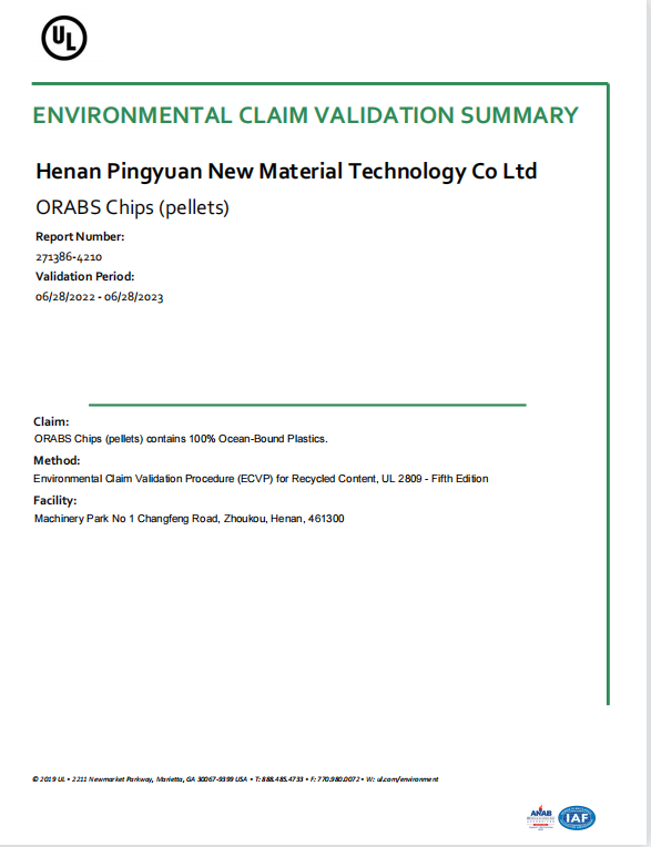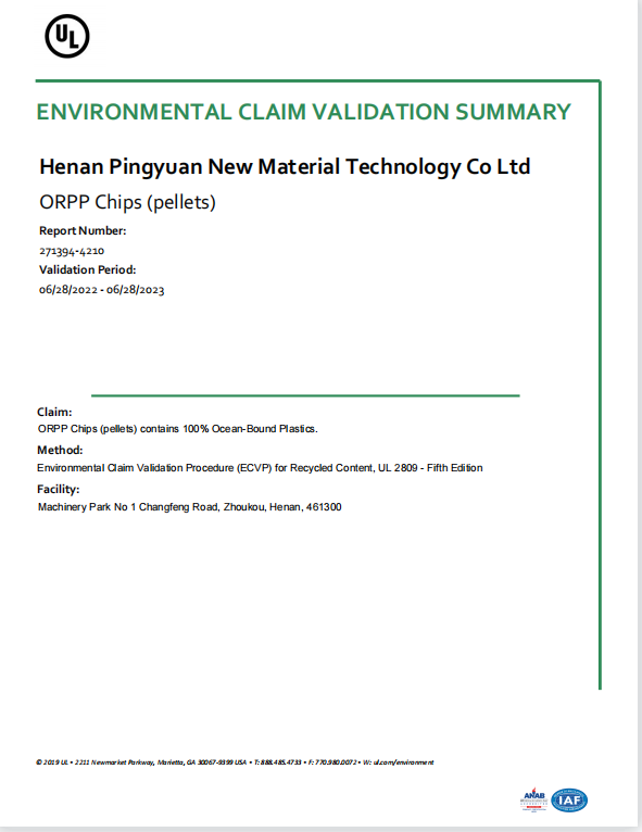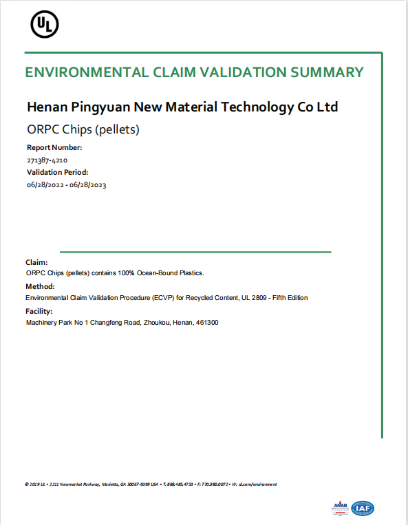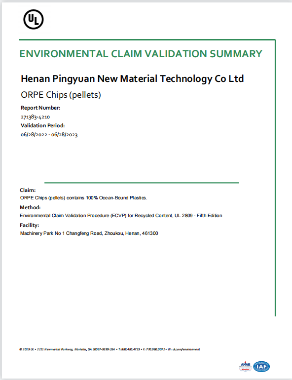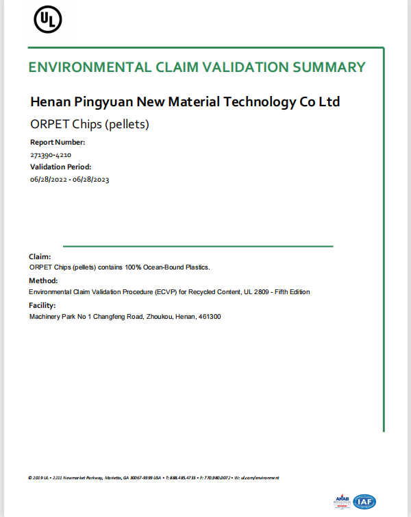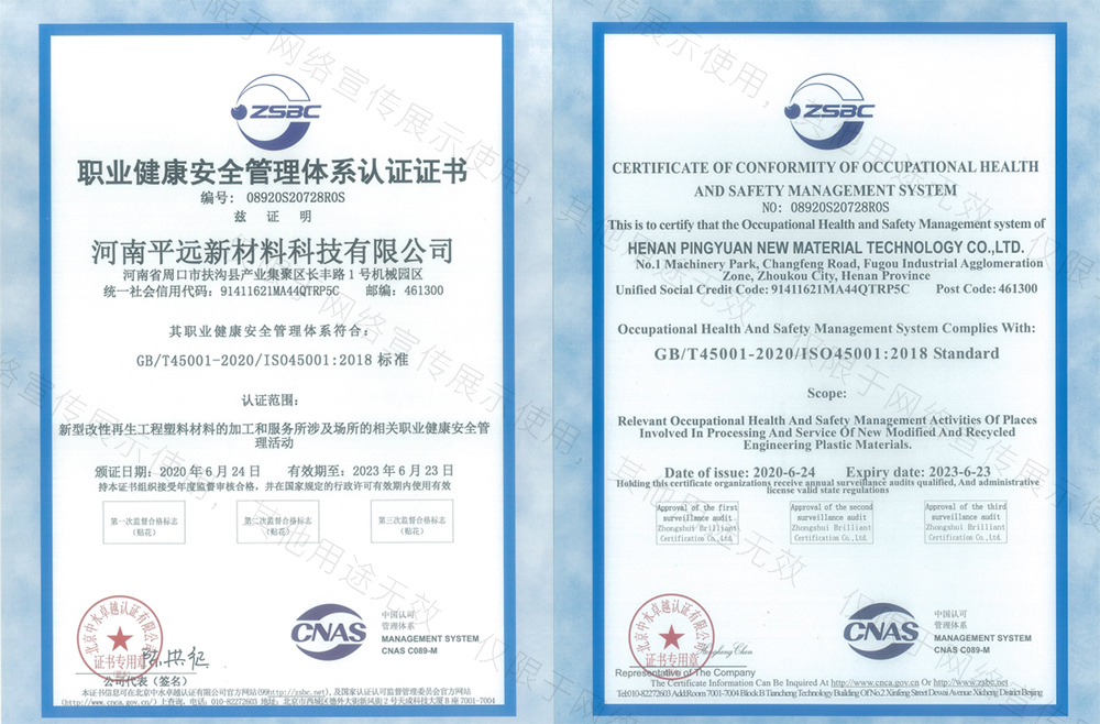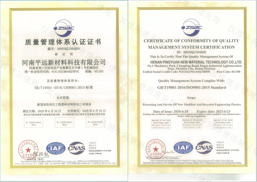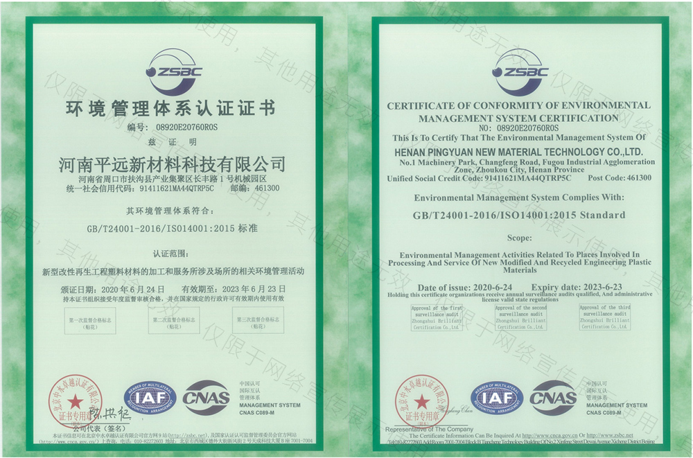 河南平遠新材料科技有限公司已通過ISO9001質(zhì)量體系、14001環(huán)境體系、45001職業(yè)健康安全管理體系認證;GRS全球回收標準認證;美國UL OBP 2809趨海塑料認證;BSCI商業(yè)社會標準認證;LCA生命周期認證。