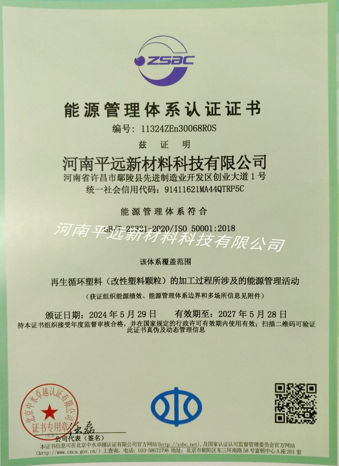 近日,河南平遠新材料科技有限公司順利通過嚴格評審,獲得國家“能源管理體系認證(Energy Management System )”證書,標志著河南平遠的節能管理工作取得巨大成效,公司能源管理體系建設邁上新臺階。