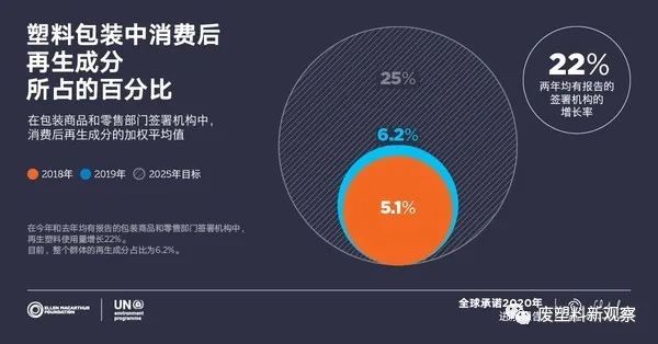 《全球承諾2020進展報告》顯示,簽署方在兩大領域實現了顯著的進展:塑料包裝使用再生成分;逐漸淘汰常見的問題材料和包裝,例如PS和PVC包裝、無法探測到的炭黑顏料和一次性塑料袋和吸管。